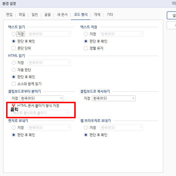 HTML 문서 붙이기 형식 지정을 클릭후 텍스트 형식으로 붙이기 옵션을 클릭합니다.